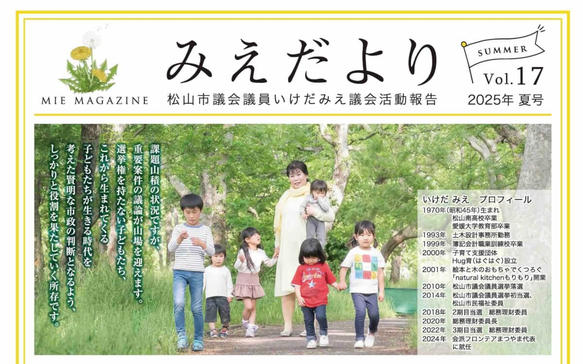 松山市議会議員として経験していくうち、今の社会には、私が感じていた問題だけでなく多くの課題が山積していることを知りました。そして、コロナ禍だからこそ明らかになった課題に丁寧に取り組み、より良い社会に変えていかねばならないと思っています。