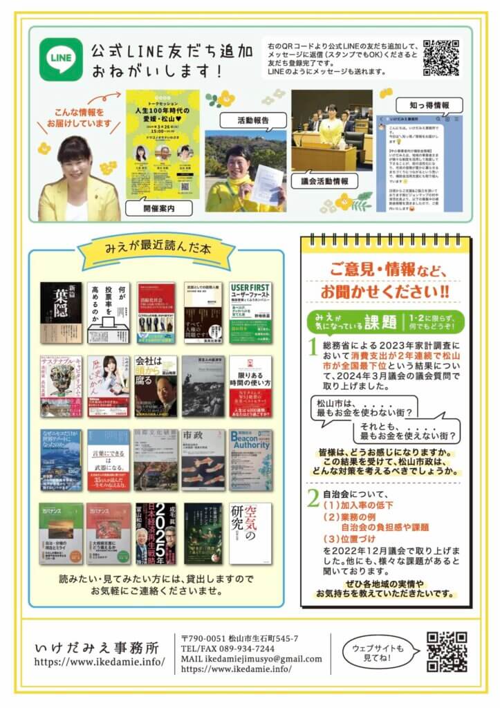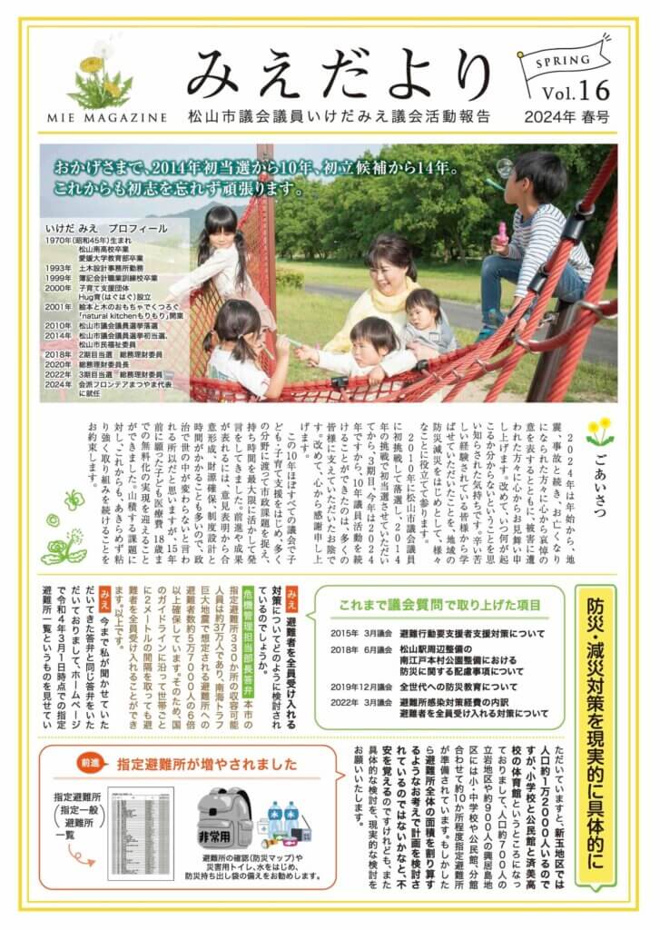 みえだよりvol.16 投稿日 2024年4月19日 更新日 2026年2月19日 著者 ikedamie カテゴリー みえだより みえだよりvol.16発行です。初立候補から14年が経ちました。これからも初志を忘れずがんばります。miedayori2404_A3ダウンロードこの記事を書いた人 ikedamie 記事一覧 FacebookInstagramLINE